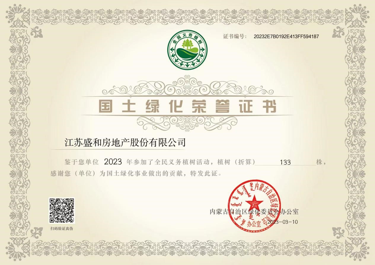植樹造林,綠化祖國,是我國的一項基本國策。今年,盛和房產參與全民義務植樹“獻一份愛心 護沿黃生態”項目,協助推進黃河流域生態保護和高質量發展。公司此次共捐資植樹133株,獲得內蒙古自治區綠化委員會辦公室頒發的國土綠化榮譽證書。